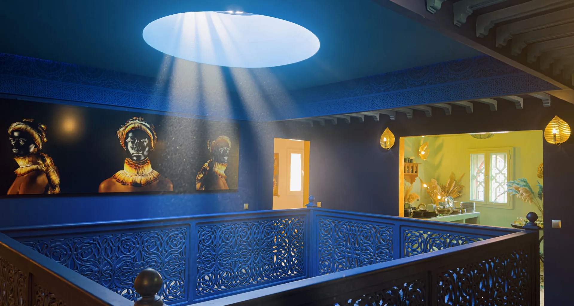 Le design intérieur du riad reflète l’essence de la marque Stella Cadente, mélangeant audacieusement les savoir-faire marocains avec une vision contemporaine de la décoration.